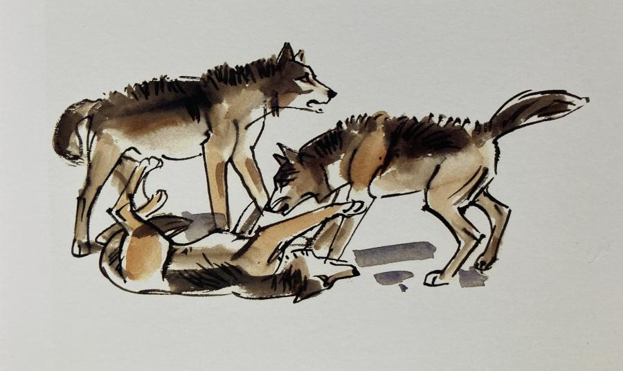 Snímek vlčice z oblasti Kokořínska a Ralska, který odhalil letošní reprodukci. Vlčice má nateklé struky, což je významný důkaz péče o narozená vlčata. Pozdější záběry z fotopastí přítomnost vlčat skutečně prokázaly.